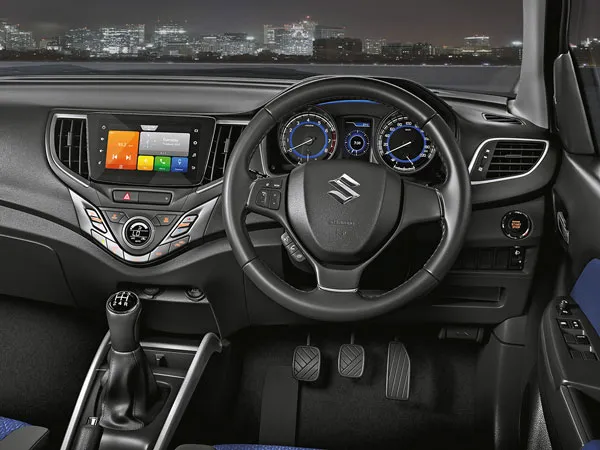 மாருதி சுஸுகி பலேனோ காரின் இன்டீரியரிலும் மாற்றங்கள் செய்யப்பட்டுள்ளது. கருப்பு வண்ண இன்டீரியர் பயன்படுத்தப்பட்டு இருக்கிறது. ஆனால், இருக்கைகள் கருப்பு மற்றும் நீல வண்ணத்தில் கொடுக்கப்பட்டு இருப்பது கவர்ச்சியாக தெரிகிறது. டேஷ்போர்டிலும், சென்டர் கன்சோல் மற்றும் ஏசி வென்ட்டுகளில் க்ரோம் அலங்காரம் பிரிமீயமாக காட்டுகிறது.