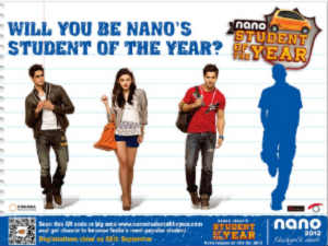 நானோ கார் விற்பனையை அதிகரிக்க தொடர்ந்து பல வழிகளில் முயற்சிகளை மேற்கொண்டு வருகிறது டாடா மோட்டார்ஸ். அந்த வகையில், பாலிவுட் இயக்குனர் கரன் ஜோஹர் இயக்கும் காதலும், காமெடியையும் கருவாக வைத்து இயக்கும் ஸ்டூடன்ஸ் ஆப் தி இயர் படத்தை பிரபலப்படுத்தும் முயற்சிகளுககு நானோ கார் பயன்படுத்தப்பட உள்ளது.