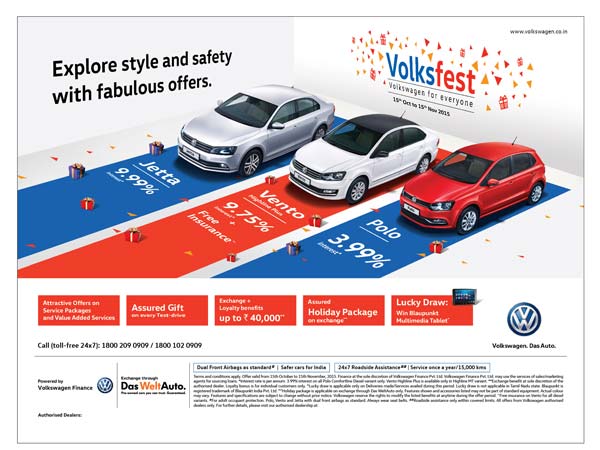 பண்டிகை காலத்தையொட்டி, ஃபோக்ஸ்வேகன் இந்தியா 2015 ஃபோக்ஃபெஸ்ட் என்ற சிறப்பு சலுகைகள் கொண்டாட்டத்தை அறிவித்துள்ளது.