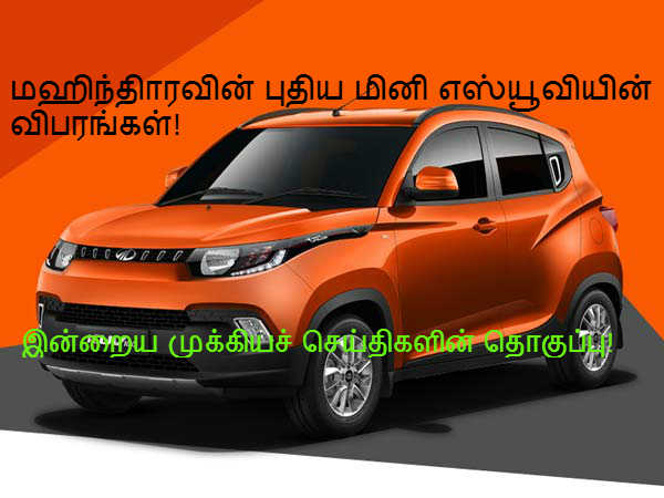 01. பெரும் எதிர்பார்ப்பை ஏற்படுத்தியிருக்கும் மஹிந்திராவின் புதிய மினி எஸ்யூவியின் பெயர், எஞ்சின் விபரங்கள் இன்று அதிகாரப்பூர்வமாக வெளியிடப்பட்டன. இதுகுறித்த விரிவானத் தகவல்களை கீழே உள்ள செய்தி இணைப்பில் சென்று படிக்கலாம்.