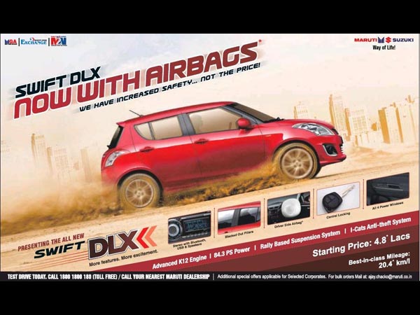 இந்த நிலையில், இந்த ஸ்விஃப்ட் டிஎல்எக்ஸ் மாடலில் தற்போது ஏர்பேக் கூடுதல் பாதுகாப்பு வசதியாக சேர்க்கப்பட்டு இருக்கிறது. இந்த தகவலை மாருதி நிறுவனம் செய்தித்தாள்களில் விளம்பரம் மூலமாக தெரிவித்துள்ளது. இதன்மூலமாக, மிகச் சிறப்பான வசதிகளுடன் மிக குறைவான விலை ஸ்விஃப்ட் வேரியண்ட்டாக மாறி இருக்கிறது.
