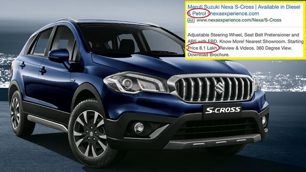 கடந்த சில மணி நேரங்களுக்கு முன்பு வரை கூகுளில் சென்று, 'Maruti S Cross petrol' என டைப் செய்து தேடியபோது, முதல் ரிசல்ட் ஆக வந்தது மாருதி சுஸூகி நெக்ஸாவின் ஒரு விளம்பரம்தான். அதில், எஸ் க்ராஸ் காரின் பெட்ரோல் வேரியண்ட் குறித்த தகவல்கள் இடம்பெற்றிருந்தன.