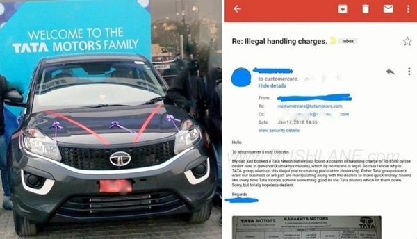 ஹேண்ட்லிங் சார்ஜ் என்பது சட்டவிரோதமானது என்பதை ஏற்கனவே அறிந்திருந்த அந்த வாடிக்கையாளர் இதுகுறித்து டாடா நிறுவனத்திற்கு இ-மெயில் மூலமாக கடிதம் அனுப்பினார். அந்த கடிதத்தில் டீலர் விபரங்களை குறிப்பிட்டு, ஹேண்ட்லிங் சார்ஜ் என்பது கட்டாயமா? என்று வினவியிருந்தார்.
