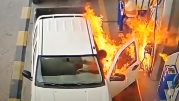 பின்னர், கண்ணிமைக்கும் நேரத்தில் எரிபொருள் நிரப்பும் பகுதியில் தீடிரென தீ ஏற்பட்டு காரின் உள் மற்றும் பக்கவாட்டு பகுதியில் பரவியது. இதனால், அதிர்ச்சியுற்ற பெட்ரோல் பங்க் ஊழியர் பெட்ரோல் நிரப்பும் பம்பை வெளியே தூக்கியெறிந்துவிட்டு ஓடிவிடுகின்றார். பின்னர், தீ முழுவதுமாக பரவுவதற்குள்ளாக தீயணைப்பான்களைக் கொண்டு தீயை கட்டுக்குள் கொண்டு வருகின்றனர்.