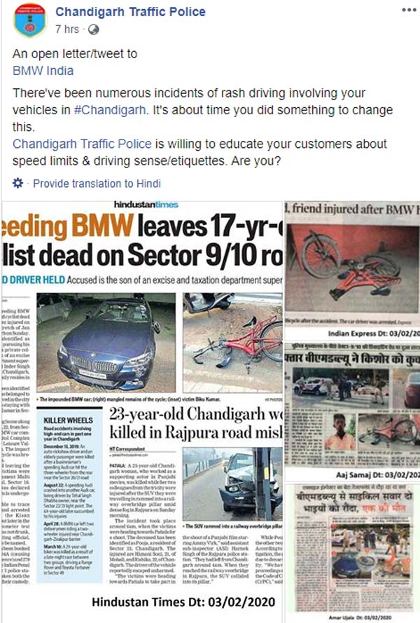 சண்டிகர் போலீஸார் தங்களின் புகாரைத் தொடர்ந்து சில செய்தி நாளிதழின் புகைப்படங்களையும் வெளியிட்டுள்ளனர். அவை, சமீபத்தில் அரங்கேறிய விபத்துகளின் புகைப்படங்கள் ஆகும். இந்த புகைப்படத்தில் காணப்படும் பெரும்பாலான விபத்துகளுக்கு பிஎம்டபிள்யூ நிறுவனத்தின் கார்களே காரணம் என கூறப்படுகின்றது.