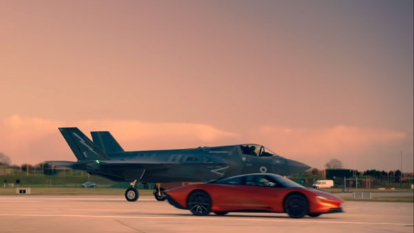 இந்த பந்தயத்தில் மெக்லாரன் ஸ்பீட்டெயில் மற்றும் எஃப்35 ஃபைட்டர் ஜெட் ரக விமான மோதியிருக்கின்றன. இவை போட்டி செய்யும் வீடியோவை டாப் கியர் என்னும் யுடியூப் சேனல் வெளியிட்டுள்ளது.
