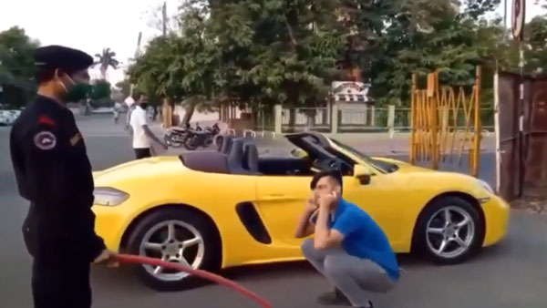 அதேசமயம், அத்தியாவசிய தேவைக்காக வெளியே வருபவர்கள் முகமூடி, கையுறை போன்றவ பாதுகாப்பு கவசங்களைக் கட்டாயம் அணிந்தே வர வேண்டும் என அறிவுறுத்தப்பட்டுள்ளது. ஆனால், இதில் எதையுமே கடை பிடிக்காத அந்த இளைஞர் ரூஃப் இல்லாத போர்ஷே 718 பாக்ஸ்டர் என்னும் ஆடம்பர காரில் வெளியே வந்துள்ளார்.