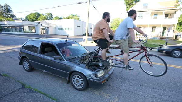 இதனால் ஹோண்டா சிவிக் சைக்கிளால் இயங்கும் காராக மாறியிருக்கின்றது. இருவர் அமர்ந்து பெடல் செய்யும் வசதிக் கொண்ட சைக்கிளை இளைஞர்கள் இதற்காக பயன்படுத்தியிருக்கின்றனர். என்னதான் இருவர் சேர்ந்து பெடல் செய்து காரை இயக்கினாலும் மணிக்கு 3.22கிமீ வேகத்திலேயே இந்த காரால் பயணிக்க முடியும்.