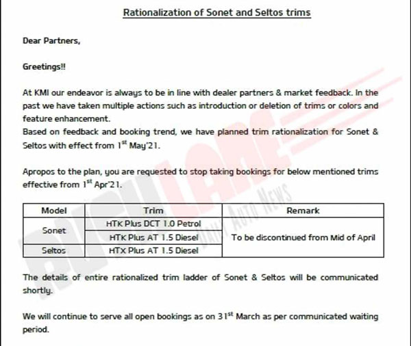 இந்த விற்பனை நிறுத்தங்கள் இந்த ஏப்ரல் மாத மத்தியில் இருந்து அமலுக்கு வரவுள்ளதாக தகவல்கள் தெரிவிக்கின்றன. இதுதொடர்பான அதிகாரப்பூர்வ அறிக்கை கியா நிறுவனத்தில் இருந்து ஒவ்வொரு டீலர்ஷிப் மையத்திற்கும் அனுப்பப்பட்டுள்ளன. அதில் ஒன்று ரஷ்லேன் செய்திதளம் மூலமாக நமக்கு கிடைத்துள்ளது.