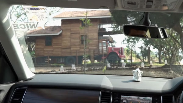 இரண்டு அடுக்குகளும் முழுக்க முழுக்க மர கட்டைகளால் கட்டமைக்கப்பட்டிருக்கின்றன. தொடர்ந்து, இதன் மேற்கூரை பழங்கால வீடுகளைப் போல் ஓடுகளைக் கொண்டிருக்கின்றது. இவ்வீட்டின் நுழைவாயில் லாரியின் பின் பக்கம் இடம் பெற்றிருக்கின்றது. இது ஓர் டாடா மோட்டார்ஸ் (Tata Motors) நிறுவன தயாரிப்பு லாரியாகும். 1970 ஆண்டு மாடல் லாரி இதுவாகும்.