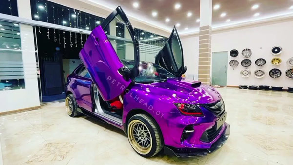 இந்த வீடியோவில் காட்டப்பட்டிருக்கும், மாடிஃபை செய்யப்பட்ட டொயோட்டா க்ளான்ஸா கார் ஆனது முந்தைய தலைமுறை மாடல் ஆகும். முழுவதுமாக கஸ்டமைஸ்ட் செய்யப்பட்டுள்ள இந்த க்ளான்ஸா காரை பார்க்கும்போது ஜப்பானின் ஜேடிஎம் கார்கள் தான் நினைவிற்கு வருகின்றன. காரின் வெளிப்பக்கம் ப்ளம் பர்பிள் நிற வ்ராப் ஆல் மூடப்பட்டுள்ளது. இதனை காட்டிலும் இந்த காரில் முக்கிய அப்கிரேடாக ஏற்கனவே கூறியதுபடி, சிஸர் கதவுகள் பொருத்தப்பட்டுள்ளன.