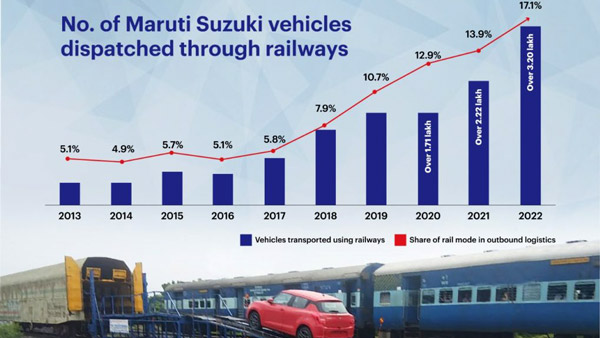 கடந்த 2022ம் ஆண்டு மட்டும் மாருதி நிறுவனம் மொத்தம் 3.2 லட்சம் வாகனங்கள் ரயில் மூலம் ஒரு இடத்திலிருந்து மற்றொரு இடத்திற்குக் கொண்டு சென்றுள்ளது. இது தான் வரலாற்றிலேயே அதிக எண்ணிக்கையாகும். இப்படியாக ரயில்கள் மூலம் மாருதி நிறுவனம் கார்களை கொண்டு செல்வது மூலம் கடந்தாண்டு மட்டும் 1800 மெட்ரிக் டன் CO2 மாசு ஏற்படுவதைத் தவிர்த்துள்ளது. இது மட்டுமல்ல 5 கோடி லிட்டர் எரிபொருள் செலவாவதையும் தவிர்த்துள்ளது.
