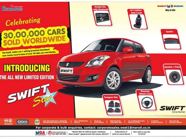 உலக அளவில் 30 லட்சம் ஸ்விப்ட் கார்களை சுஸூகி நிறுவனம் விற்பனை செய்துள்ளதை ஏற்கனவே தெரிவித்திருந்தோம். இதனை கொண்டாடும் விதமாக கூடுதல் ஆக்சஸெரீஸ்களுடன் புதிய ஸ்விப்ட் ஸ்டார் என்ற லிமிடேட் எடிசன் மாடலை அறிமுகம் செய்துள்ளது மாருதி.