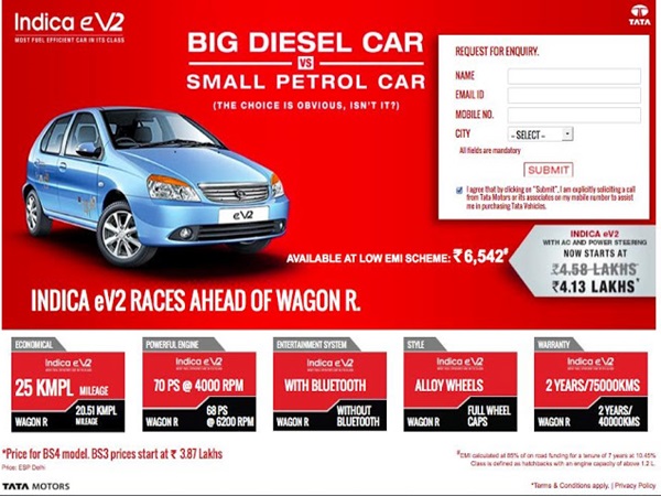 இதுதவிர, மாருதி வேகன்-ஆர் காருடன் இண்டிகா இவி2 டீசல் காரை ஒப்பிட்டு சாதகமான அம்சங்களை குறிப்பிட்டு விளம்பரம் செய்துள்ளது. படத்தில் அந்த ஒப்பீட்டு அம்சங்களை காணலாம்.