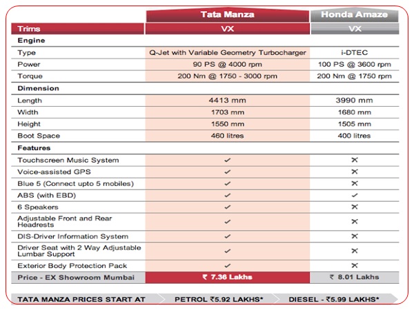 இதுபோன்று ஒப்பீட்டு விளம்பர பிரச்சாரம் செய்வது டாடாவுக்கு புதிதல்ல. இதற்கு முன் ஸ்விப்ட் காரைவிட விஸ்டா கார் சிறந்தது என ஒரு ஒப்பீட்டு விளம்பர பிரச்சாரத்தை டாடா செய்தது. சமீபத்தில் மாருதி வேகன் ஆர் காருடன் இண்டிகா இவி2 டீசல் காரை ஒப்பிட்டு விளம்பர பிரச்சாரம் மேற்கொண்டது.இந்த நிலையில், சமீபத்தில் விற்பனைக்கு வந்து வரவேற்பை பெற்றிருக்கும் ஹோண்டா அமேஸ் காருடன், மான்ஸாவை ஒப்பிட்டுள்ளது டாடா. கீழே உள்ள படத்தில் டாடா வெளியிட்டிருக்கும் ஒப்பீட்டு தகவல்கள்.
