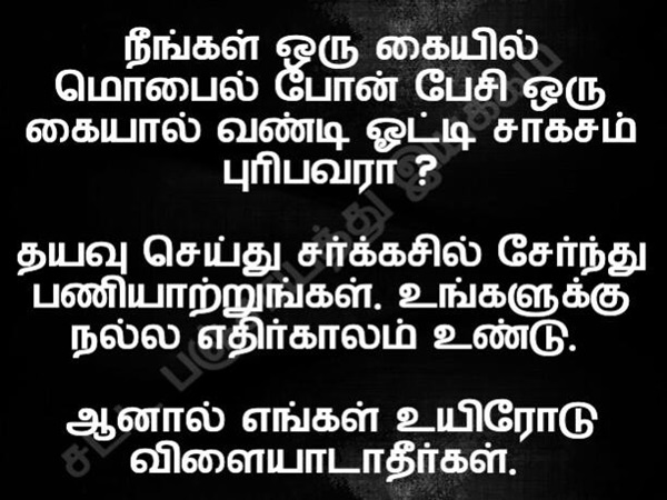 நாட்டிலேயே விபத்துக்களால் அதிக உயிரிழப்புகள் ஏற்படுவதில் தமிழகம் முன்னிலை வகிக்கிறது. இதில், மது அருந்திவிட்டு வாகனம் ஓட்டுபவர்களால் ஏற்படும் மரணங்களின் எண்ணிக்கை அதிகமாகி வருகிறது. இதுதொடர்பாக, 'சட்டப் பஞ்சாயத்து இயக்கம்' ஃபேஸ்புக்கில் வெளியிட்டிருக்கும் விழிப்புணர்வு வாசகத்தை உங்கள் பார்வைக்கு விடுகிறோம்.