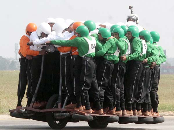 ராணுவ வீரர் சுபீதார் ராம்பால் யாதவ் பைக்கை ஓட்டினார். சாகச நிகழ்ச்சி தொடங்கப்பட்ட போது முதற்கட்டமாக 30 வீரர்கள் பயணித்தனர்.