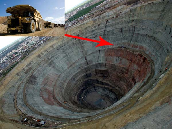 மிர் வைர சுரங்கத்திற்குள் எறும்பு போல நிற்கும் ராட்சத தம்ப் டிரக். சுரங்கத்தின் பிரம்மாண்ட்டத்தை காட்டும் ஒரு சாம்பிள்.