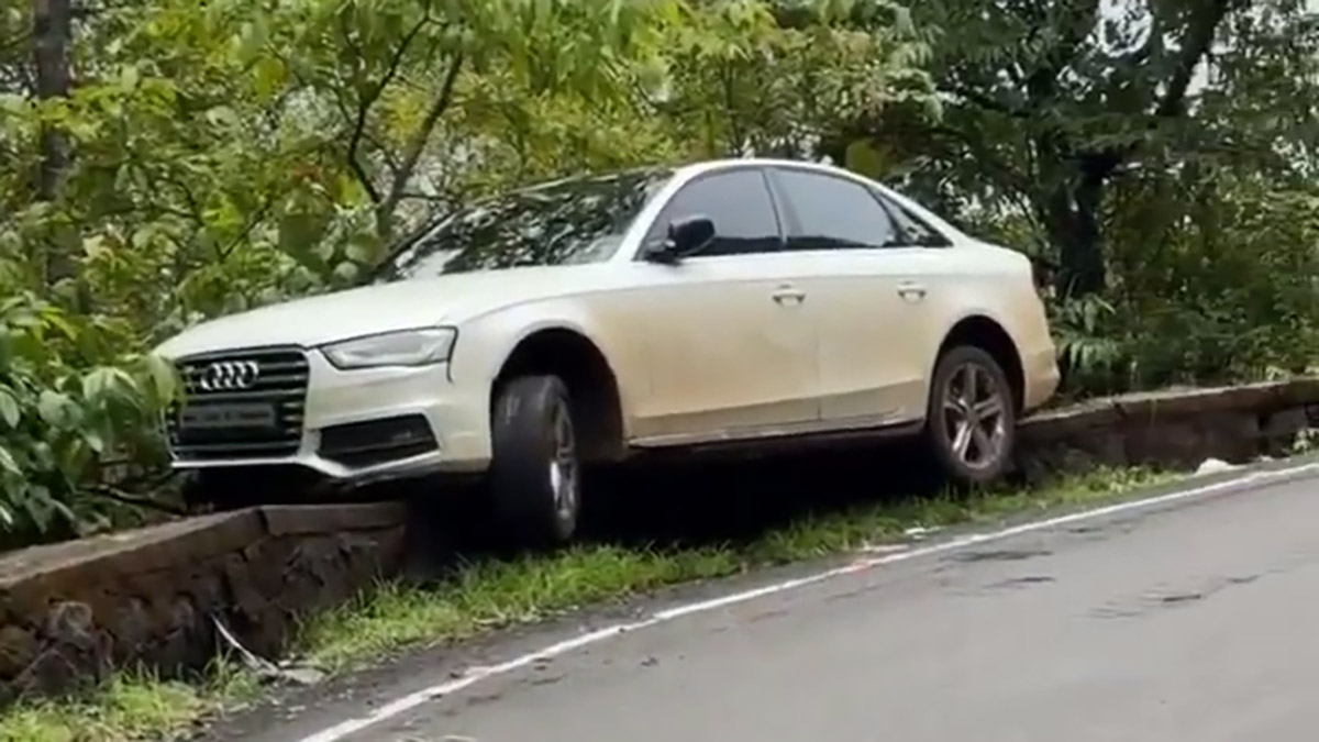 திலாரி காட் வால் பகுதியில் சென்று கொண்டிருந்த விலையுயர்ந்த ஆடி ஏ4 கார் திடீரென கட்டுப்பாட்டை இழந்து மலையில் இருந்து கீழே விழ பாய்ந்தது. ஆனால் நல்லவேளையாக, காரின் 2 சக்கரங்கள் சாலையின் தடுப்பு சுவரில் சிக்கிக் கொண்டு நின்றன. அதாவது, காரின் மற்ற 2 சக்கரங்கள் அந்த தடுப்பு சுவரையும் தாண்டி சென்ற நிலையில், மீதி 2 சக்கரங்கள் சுவரை தாண்ட முடியாமல் சிக்கின.