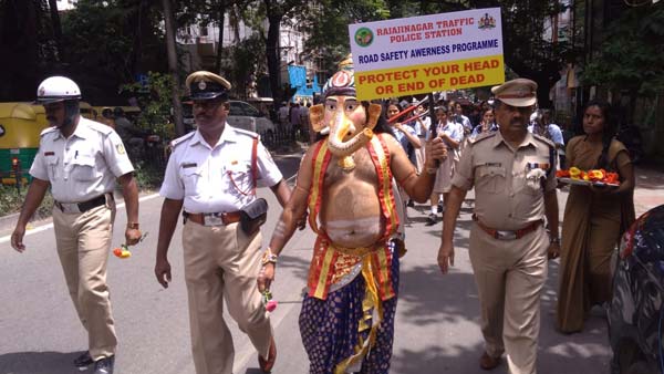 அதாவது பெங்களூரு பெரு நகர போலீசார் தற்போது ஏற்படுத்தி வரும் விழிப்புணர்வு நடவடிக்கைகளில், விநாயகர் போன்று வேடம் தரித்தவர்களும் பங்கேற்கின்றனர். பொதுமக்கள் உள்பட அனைவரின் கவனத்தையும் இது ஈர்த்துள்ளது.