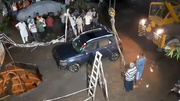 யாரும் தங்களது காரை குழிக்கு அருகில் பார்க் செய்யமாட்டார்கள். அதனால் இந்த குழி நிச்சயம் மழையினாலேயே திடீரென ஏற்பட்டிருக்கும். முன் சக்கரங்கள் குழிக்குள் நுழைந்ததை அடுத்து பேலன்ஸை இழந்த கார் முற்றிலுமாக உள்ளே சென்றுவிட்டது.