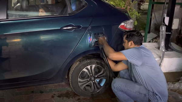 ஷிண்டோ ஆண்டனி என்பவர் தனது டிகோர் எலக்ட்ரிக் காரில் குடும்பத்துடன் வெளியே சென்றுவிட்டு திருச்சி வழியாக மீண்டும் வீட்டை நோக்கி பயணித்துள்ளார். அப்போது வழியில் ஒரு உணவகத்தில் உணவுகளை வாங்க காரை நிறுத்திய போது, சரி அப்படியே காருக்கு சார்ஜையும் ஏற்றி கொள்வோம் என ஃபாஸ்ட் சார்ஜரை காருடன் ப்ளக்-இன் செய்துள்ளார்.