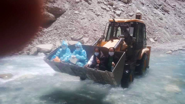 அதனால் தான் இந்த மருத்து பணியாளர் குழுவினர் ஆற்றை கடக்க ஜேசிபி எனப்படும் பொக்லைன் இயந்திர வாகனத்தை பயன்படுத்தியுள்ளனர், வேறு வழியும் இல்லை. லடாக் நாடாளுமன்ற உறுப்பினர் டீசேரிங் நமஃபயல் அவர்கள் இந்த தகவலை படத்துடன் அவரது டுவிட்டர் பக்கத்தில் பகிர்ந்துள்ளார்.