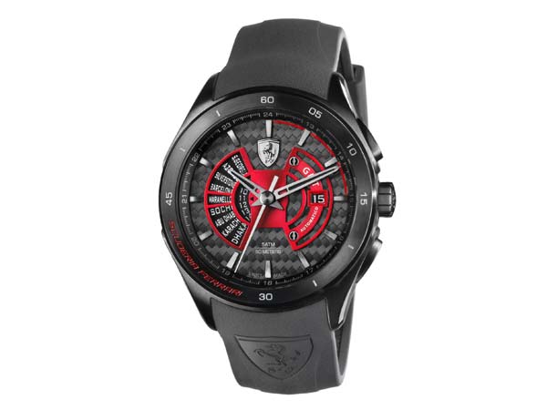 சிகப்பு நிறம் கலந்த பிளாக் டையல், ஃபெராரி எஃப்எக்ஸ்எக்ஸ் காரின் சேஸி போல்ட்களை போன்றே தோற்றம் அளிக்கிறது.