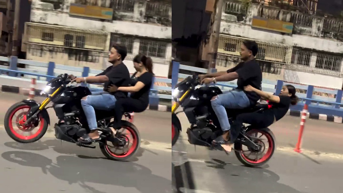 மேற்கு வங்காளத்தில் நடைபெற்றுள்ள இந்த சம்பவத்தில் ஆண், பெண் என இருவர் யமஹா எம்டி15 பைக்கில் சென்றுள்ளனர். மேம்பாலம் ஒன்றின் மீது சென்ற போது, பைக்கை ஓட்டிக் கொண்டிருந்தவர் திடீரென பைக்கின் முன் சக்கரத்தை தூக்கி வீலிங் செய்ய முயற்சித்துள்ளார். இத்தனைக்கும். ஒரு அடி உயரத்திற்கு கூட அவர் பைக்கின் முன் சக்கரத்தை தூக்கியிருக்க மாட்டார்.