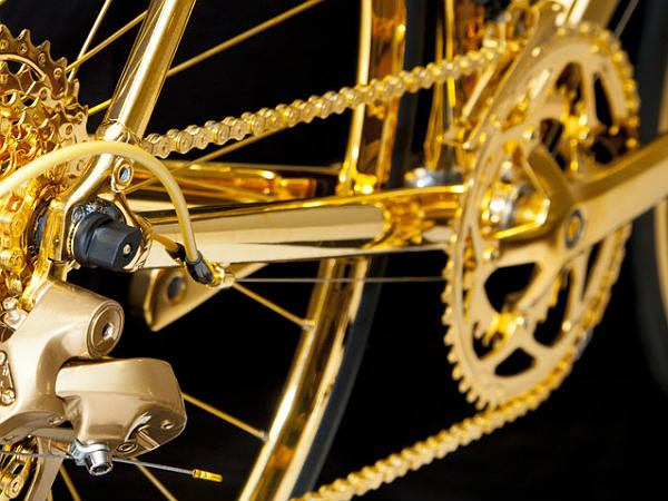 தங்க நிற சைக்கிளில் ஆங்காங்கே கருப்பு வண்ணத்தில் பூச்சு கொடுத்து சைக்கிளின் வசீகரித்தை பன்மடங்கும் அதிகரித்துள்ளனர். இந்த சைக்கிளின் அனைத்து பாகங்களிலும் 24 காரட் தங்க முலாம் பூச்சுக் கொடுக்கப்பட்டுள்ளது. இதன் மதிப்பு ரூ.2.42 கோடியாக தெரிவிக்கப்பட்டிருக்கிறது.