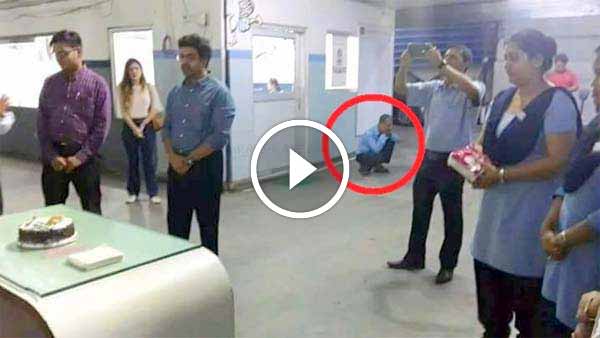 அப்போது ஊழியர்கள் அனைவரும் கேக் வெட்டி கொண்டாட்டத்தில் திளைத்து கொண்டிருந்தனர். ஆனால் ஒரு ஊழியர் மட்டும் தரையில் முட்டி போட வைக்கப்பட்டிருந்தார். அவர் வலி தாங்காமல் தனது காதுகளை பிடித்திருந்தார். பேஸ்புக் உள்ளிட்ட சமூக வலைதளங்களில் இந்த படம் வைரலாக பரவியது.