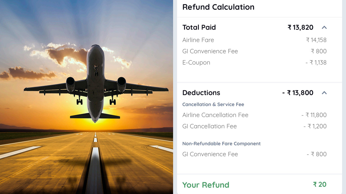 இது குறித்த ஸ்கிரீன் ஷாட்டை அவர் சமூக வலைத்தளங்களில் பகிர்ந்து உள்ளார். அதன்படி ஏர்லைன் கேன்சலேஷன் கட்டணம் ₹11, 800, ஜிஐ கேன்சலேஷன் கட்டணம் ₹1200 ஜிஐ கன்வின்ஸ் ஃபீஸ் திருப்பி வழங்கப்படாததால் ₹800 ஆக மொத்தம் ₹13800 கழிக்கப்பட்டு ₹20 ரீஃபன்ட்டாக கிடைத்துள்ளது.