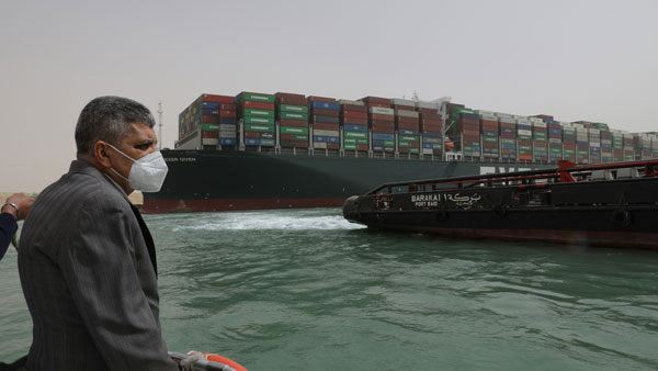 மேலும், பல கப்பல்கள் ஆங்காங்கே நிறுத்தி வைக்கப்பட்டுள்ளதால், உலகின் பல்வேறு நாடுகளுக்கு செல்ல வேண்டிய சரக்கு மற்றும் கச்சா எண்ணெய் குறித்த நேரத்தில் செல்ல முடியாத நிலை ஏற்பட்டுள்ளது. இதுவரை கிடைத்துள்ள தகவல்களின்படி, மணல் புயலால் கப்பல் கட்டுப்பாட்டை இழந்து தரை தட்டியதாக கூறப்படுகிறது.