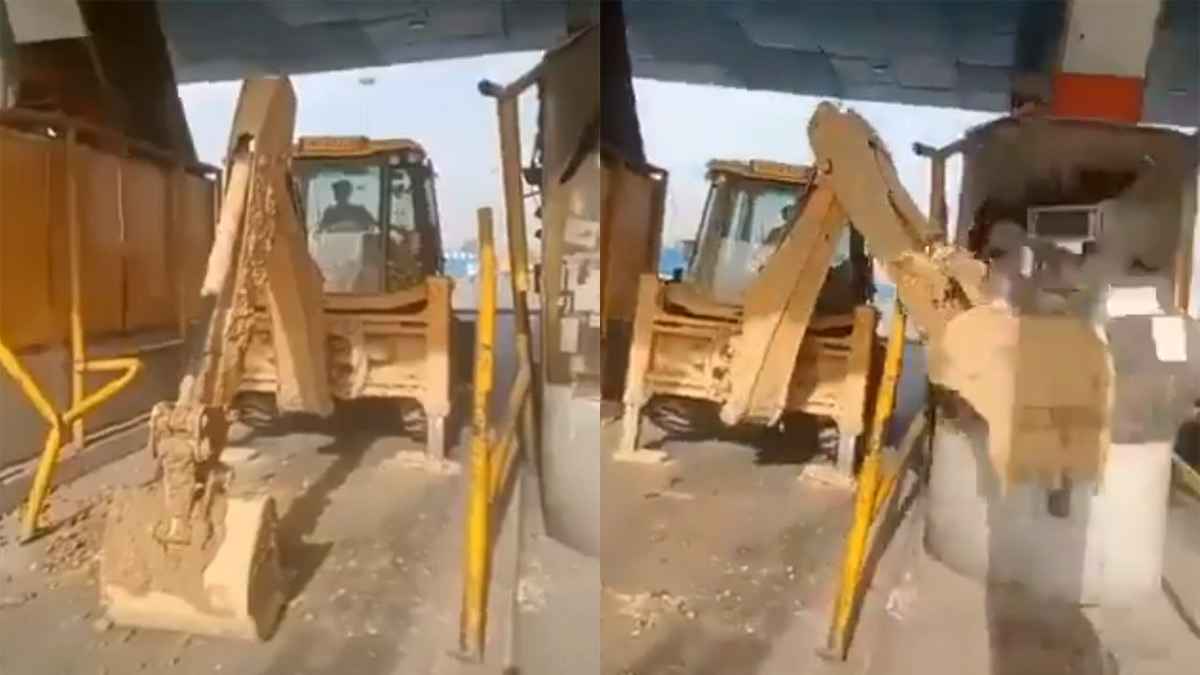 இதில் மிகுந்த கோபமடைந்த ஜேசிபி டிரைவர் வாகனத்தை ஸ்டார்ட் செய்து அங்கிருந்த இரு கட்டணம் வசூலிக்கும் அறைகளை அடித்து துவம்சம் செய்துள்ளார். இதனை அங்கிருந்தவர்கள் தங்களது மொபைல் போனில் காட்சிப்படுத்தி இணையத்தில் வெளியிட்டுள்ளனர். மேலும், இதுகுறித்து அருகில் உள்ள போலீசாருக்கும் தகவல் தெரிவிக்கப்பட்டது.