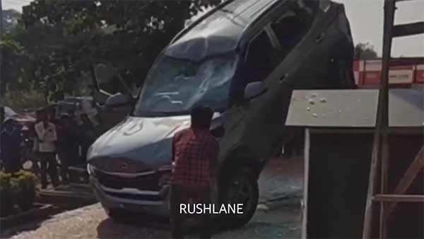 நமக்கு தெரிந்து இந்த கியா செல்டோஸ் கார் எந்தவொரு திட்டமும் இல்லாமல் முதல் மாடிக்கு ஏற்றப்பட்டு இருக்கும். காரின் முன்புறம் பலமாக கண்ணாடியை உடைத்து கீழே முன்புறமாக விழுந்துள்ளது. இதில் காரின் கண்ணாடி, முன்புற க்ரில் உள்பட பல பகுதிகள் பலத்த சேதமடைந்துள்ளன.