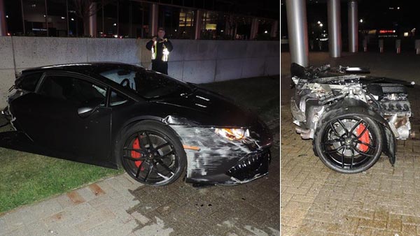 இதனால் கார் அவர் கட்டுப்பாட்டை இழந்து மின்னல் வேகத்தில் பறந்தது. தெடர்ந்து ரோட்டில் இருந்த காண்கிரீட் கம்பத்தில் மோதியது. இதில் லம்போர்கினி இரண்டு துண்டாக உடைந்தது. நல்லவேலையாக இச்சம்பவம் அதிகாலை வேலையில் ரோட்டில் வேறு வாகனங்கள் செல்லாத போது நடந்தது.