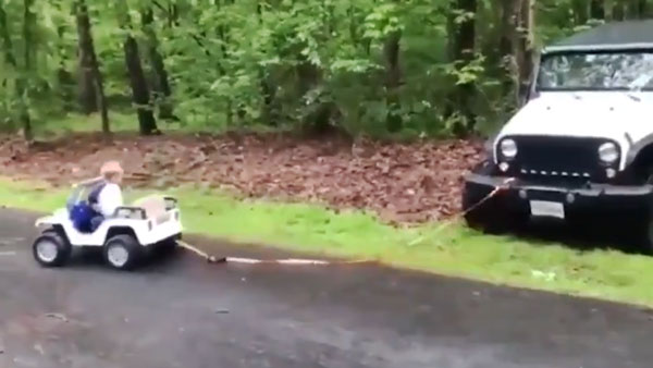 தன்னுடைய தந்தையின் உண்மையான பெரிய காரை பள்ளத்தில் இருந்து மீட்பதற்கு அந்த சிறுவன் பொம்மை காரை பயன்படுத்தியுள்ளார். அந்த சிறுவனின் சிறிய காரும், அவனுடைய தந்தையின் உண்மையான பெரிய காரும், நீளமான கயிறு ஒன்றின் மூலமாக இணைக்கப்பட்டுள்ளதை இந்த காணொளியில் நம்மால் பார்க்க முடிகிறது.