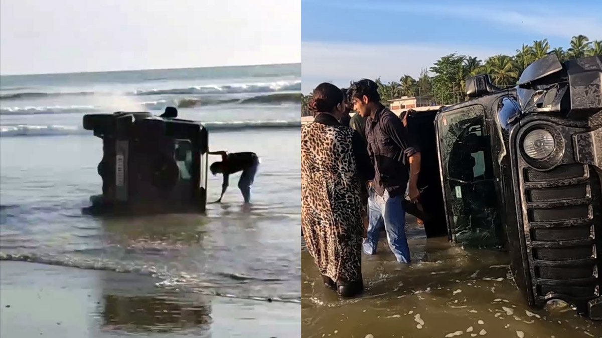 இதன் காரணமாகவே இந்த பகுதியில் நாள்தோறும் நூற்றுக்கணக்கான வாகனங்கள் கடலை நோக்கி வந்து செல்வதை பார்க்க முடியும். அந்த வகையில், சமீபத்தில் மஹிந்திரா தார் வாகனத்தில் முழப்பிலாங்காடு கடற்கரைக்கு சென்ற இருவர் அதிவேகமாக ஓட்டி தங்களது மஹிந்திரா தார் வாகனத்தை கடற்கரையில் ஒருபக்கமாக கவிழ்த்துள்ளனர்.