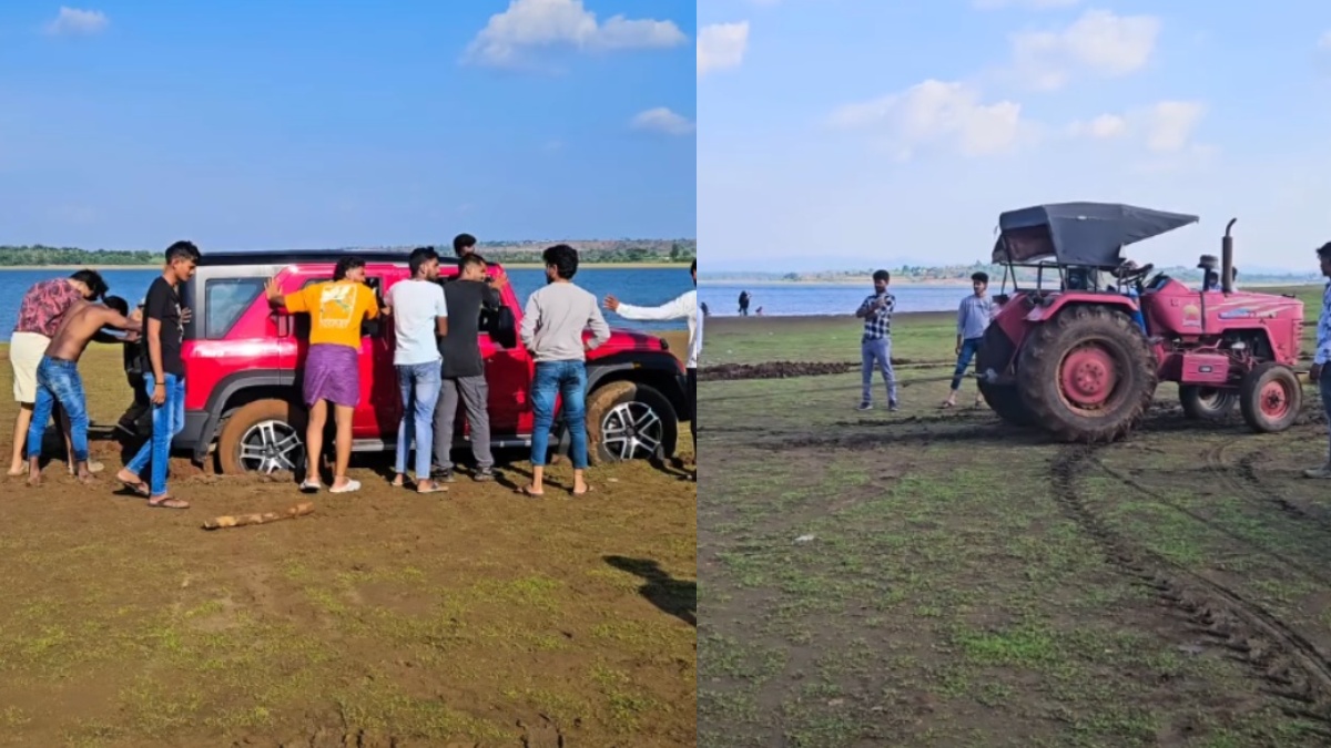 நண்பர்கள் சிலர் தங்களது சிவப்பு நிறத்திலான மஹிந்திரா தார் ராக்ஸ் வாகனத்தில் அடிக்குற கோடை வெயிலுக்கு இதமாக நீர் நிரம்பிய ஏரி ஒன்றை சுற்றி பார்க்க சென்றுள்ளனர். நீரை பார்த்த சந்தோஷத்தில் வாகனத்தை ஏரிக்கு மிக அருகாமையில் ஓட்டி சென்ற போது, தார் ராக்ஸ் வாகனத்தின் பின் சக்கரங்கள் சேற்றில் சிக்கியுள்ளன.