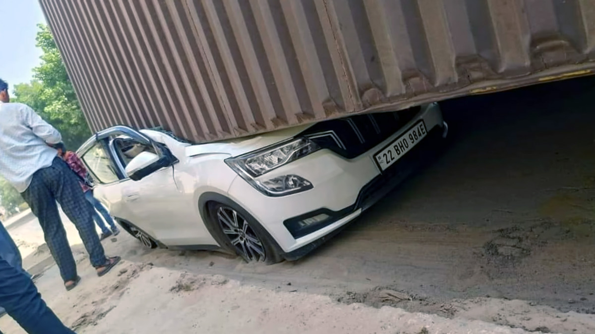 இதன் காரணமாக கண்டெய்னர் லாரி ஓரமாக நிறுத்தப்பட்டிருந்தது. அப்போது அவ்வழியாக மஹிந்திரா எக்ஸ்யூவி 700 கார் ஒன்று வந்தது. அந்த நேரத்தில் கண்டெய்னர் லாரி எதிர்பாராத விதமாக சரிந்து, மஹிந்திரா எக்ஸ்யூவி 700 காரின் மீது விழுந்துள்ளது. இதன் காரணமாக மஹிந்திரா எக்ஸ்யூவி 700 கார் அப்பளம் போல் நொறுங்கியுள்ளது.