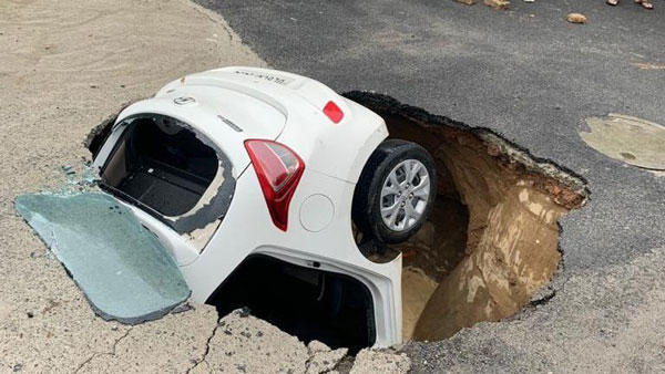 சாலையில் ஏற்பட்ட திடீர் பள்ளத்தில் கார் கவிழ்ந்திருக்கும் சம்பவம் அதிர்ச்சியை ஏற்படுத்தியுள்ளது. இதுகுறித்த தகவல்களை இந்த செய்தியில் பார்க்கலாம்.