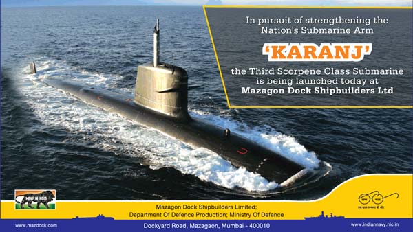 விரைவில் கடற்படையில் இணைக்கப்படவுள்ள காந்தாரி கப்பலுக்கு பிறகு ஃபிரான்ஸ் நேவல் குரூப் நிறுவனம் இந்திய கடற்படைக்காக தயாரித்துள்ள புதிய நீர்மூழ்கி போர்கப்பல் ஐஎன்எஸ் கரஞ்ச்.