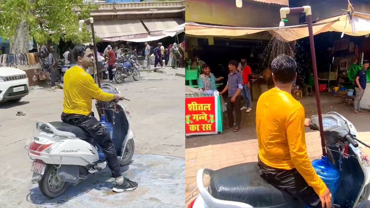 ஃபன் வித் சிங் என்கிற இன்ஸ்டாகிராம் பக்கத்தில் வெளியிடப்பட்டுள்ள இந்த வீடியோவின் துவக்கத்தில், பாத் ரூம் ஷவர் மூலமாக ஸ்கூட்டரில் இளைஞர் ஒருவர் குளித்துக் கொண்டே செல்வது காட்டப்படுகிறது. குளித்துக் கொண்டே செல்கிறார் என சொல்வதை காட்டிலும், தன் உடலை குளுமைப்படுத்திக் கொண்டே செல்கிறார் என்று சொல்வதுதான் சரியாக இருக்கும்.