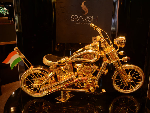 மும்பையில் தங்க முலாம் பூச்சுடன், வைரக்கற்கள் பதிக்கப்பட்ட மாதிரி பைக் ஒன்றை பிரபல ஆபரண வர்த்தக நிறுவனம் வடிவமைத்து காட்சிக்கு வைத்துள்ளது.