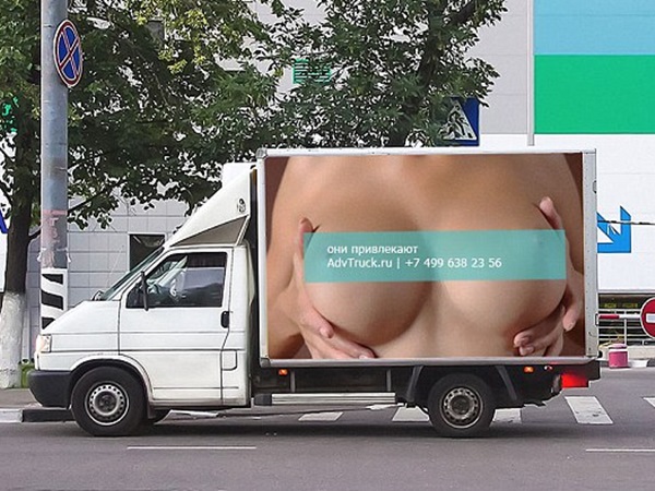 ரஷ்யாவை சேர்ந்த விளம்பர நிறுவனம் ஒன்று வாகனங்களின் பக்கவாட்டில் விளம்பர பலகைகளை பொருத்துவதற்கு முடிவு செய்தது. மேலும், இதுபோன்று விளம்பரம் செய்ய வாடிக்கையாளர்களை கவர்வதற்காக பெண் ஒருவர் மார்பகங்களை காட்டும் வகையில், படு கவர்ச்சியான விளம்பர பலகைகளை டிரக்குகளில் பொருத்தி மாஸ்கோ சாலைகளில் விட்டது.