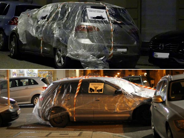 முறைகேடாக பார்க்கிங் செய்யப்படும் கார்களை ஸ்டெட்கார்ட் நகரவாசிகள் ஒரு பரிசு பொருள் போல அலங்கரிப்பதை தொடர்ந்து வருகின்றனர்.