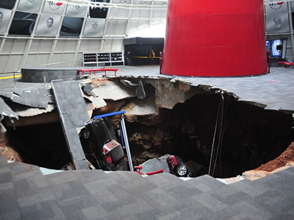 அமெரிக்காவில் கென்டக்கி என்ற இடத்தில் செவர்லே கார்வெட் கார்களுக்கான பிரத்யேக கண்காட்சியகம் உள்ளது. கடந்த பிப்ரவரி மாதம் இந்த மியூசியத்தில் உள்ள ஸ்கைடோம் என்ற கண்காட்சி அரங்கின் உள்பகுதியில் பூமி உள்வாங்கி 40 அடி ஆழத்திற்கு திடீர் பள்ளம் ஒன்று உருவானது.
