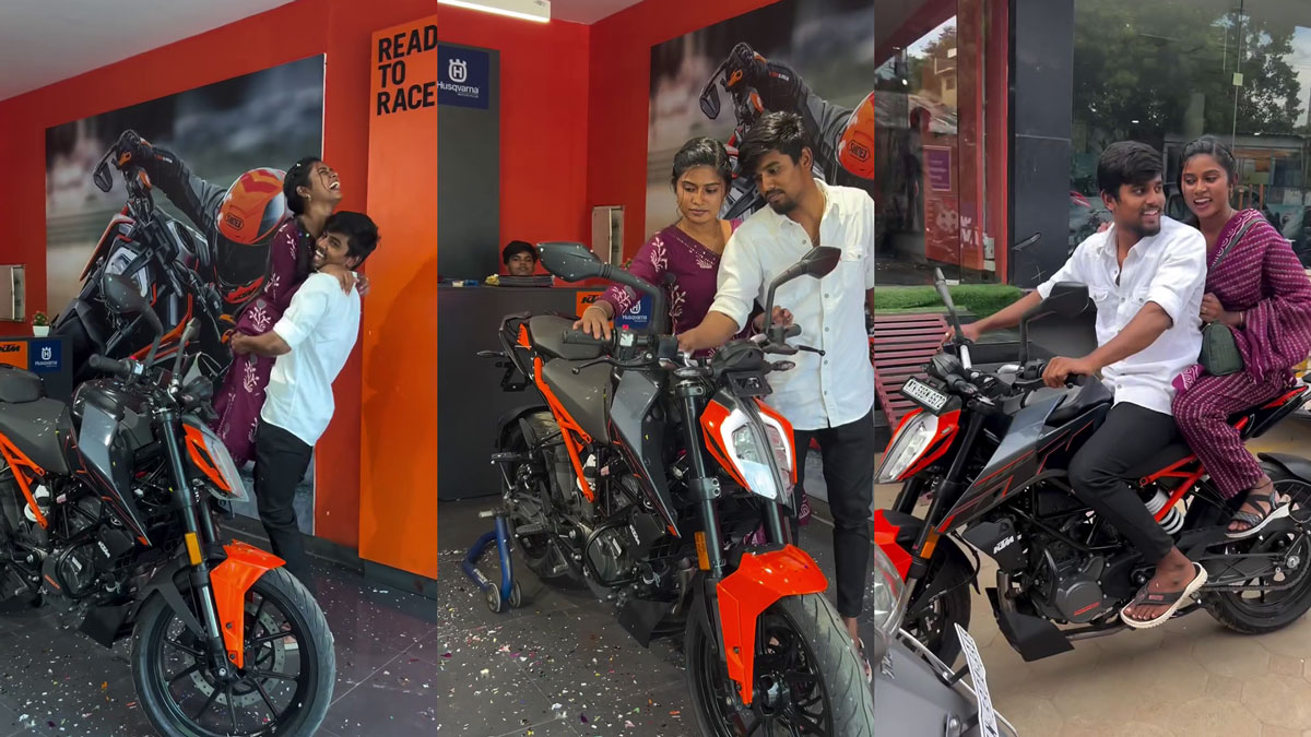 இந்த முறை தம்பியின் ஆசையை எப்படியாவது நிறைவேற்றி விட வேண்டும் என்ற காத்திருந்த அக்கா கொஞ்சம் கொஞ்சமாக பணம் சேர்த்து வைத்து தம்பிக்கு பிறந்தநாள் பரிசாக சொந்தமாக பைக் ஒன்றை வாங்கி பரிசளித்துள்ளார். தம்பிக்கு அவருக்கு பிடித்த கேடிஎம் நிறுவனத்தின் டியூக் 200 பைக்கை வாங்கி பரிசளித்துள்ளார்.