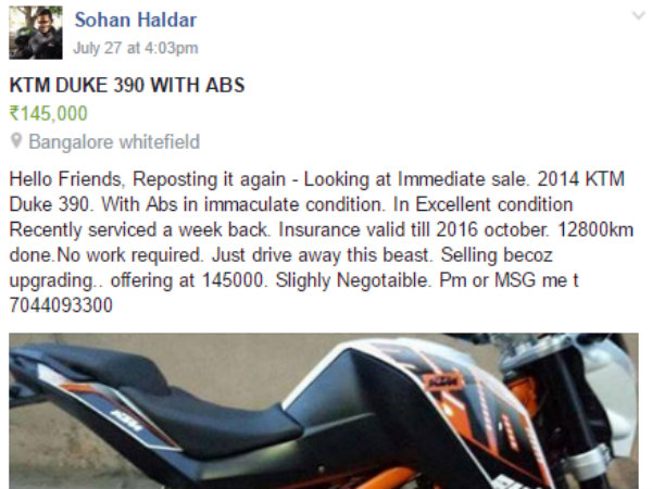 கடந்த ஜூலை 27ந் தேதி சோஹன் ஹல்தர் தனது கேடிஎம் டியூக் 390 பைக்கை விற்பனை செய்வதற்காக, ஃபேஸ்புக் பக்கம் ஒன்றின் மூலமாக விளம்பர பதிவை போட்டிருக்கிறார். அதில், வண்டியின் கண்டிஷன், எவ்வளவு தூரம் ஓடியது என்பதுடன், எவ்வளவு விலை என்ற விபரத்தையும் தெரிவித்திருந்தார். இதைவிட உயர்வகை பைக்கை வாங்கும் எண்ணத்தில் இந்த பைக்கை விற்பனை செய்வதாகவும் காரணத்தை குறிப்பிட்டு, அவரது மொபைல்போன் எண்ணையும் போட்டிருந்தார்.