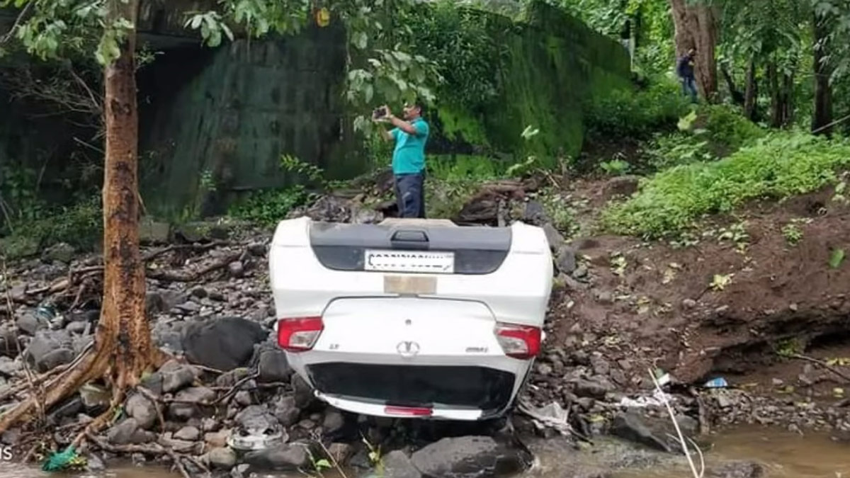 அப்போது மழை பெய்து கொண்டிருந்ததாக தெரிகிறது. அந்த நேரத்தில் சாலையில் வந்த வளைவு ஒன்றை, டிரைவர் கவனிக்க தவறி விட்டார். இதனால் கட்டுப்பாட்டை இழந்த டாடா டியாகோ கார், பாலம் ஒன்றின் மேலே இருந்து கீழே விழுந்தது. பாலத்தில் இருந்து தலைகீழாக கவிழ்ந்த காரணத்தால், டாடா டியாகோ கார் பலத்த சேதத்தை சந்தித்தது.